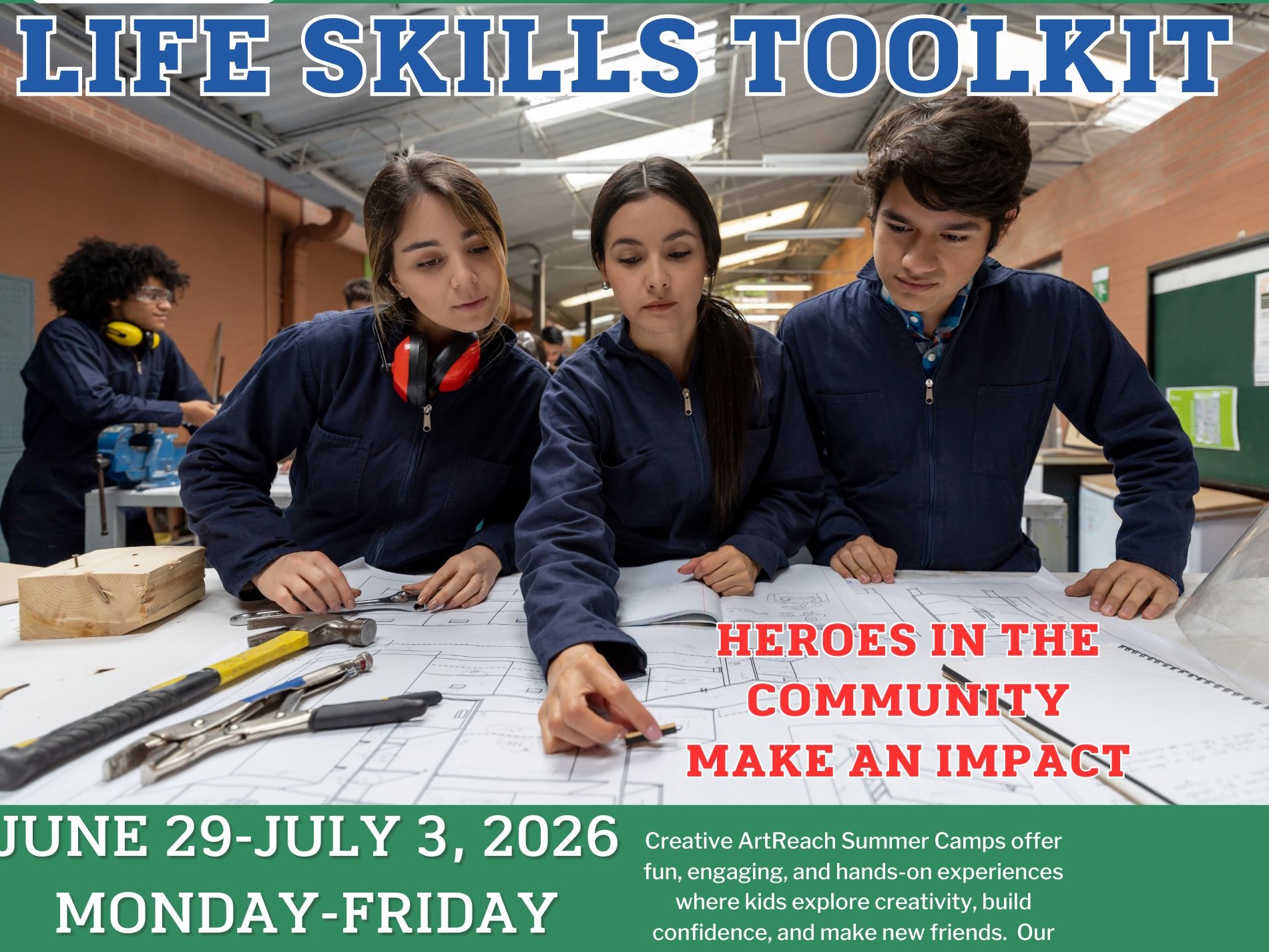 Step into your leadership potential this summer! In Life Skills Toolkit: Heroes in the Community, middle school students will explore what it means to be a positive leader and role model while developing real-world life skills. Through hands-on activities, discussions, and team challenges, campers will learn about responsibility, communication, goal setting, and how to make thoughtful decisions that positively impact others.